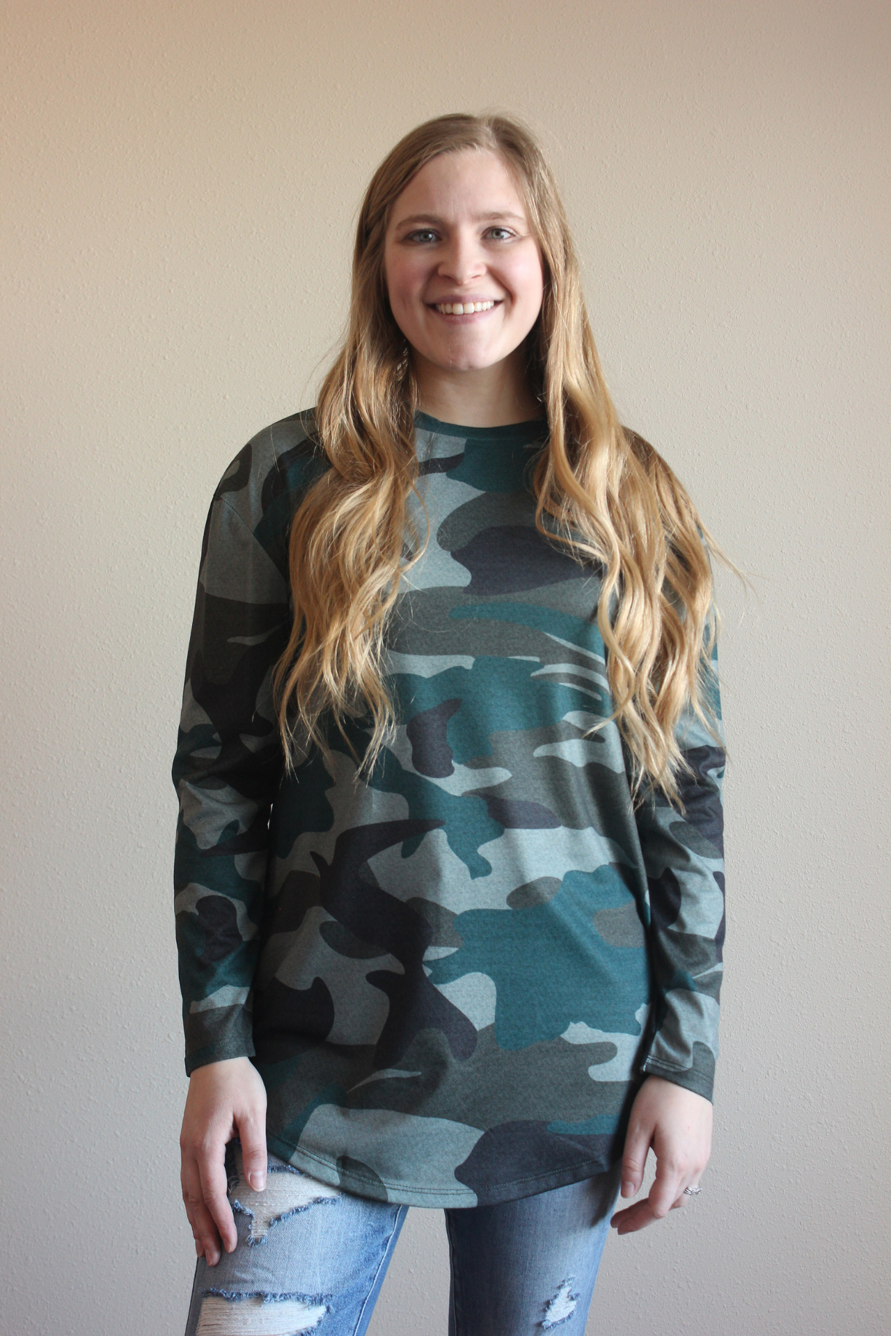 This camouflage top is the perfect top to throw on and head to town.